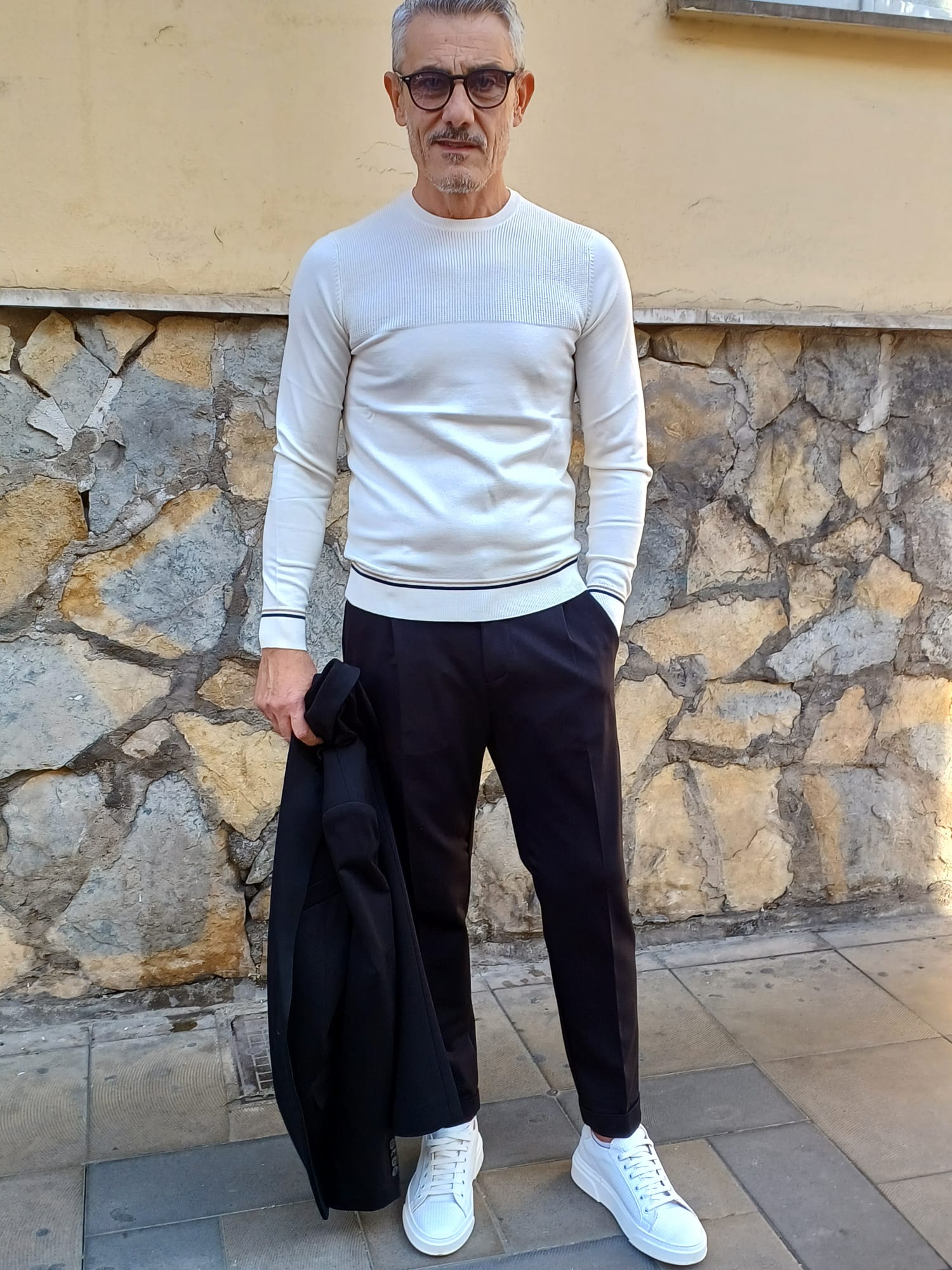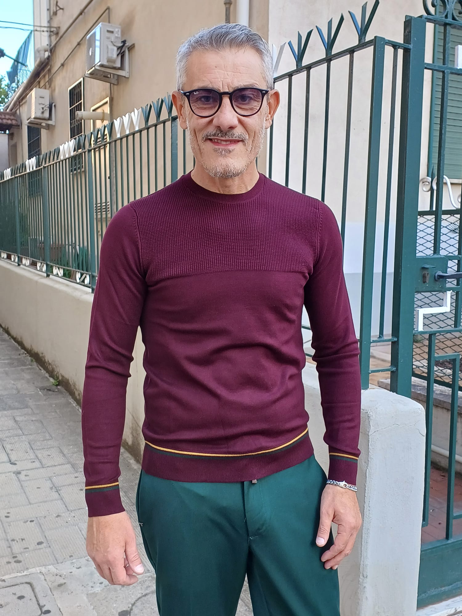 -Maglia girocollo con tecnica a intarsio nella sezione alta  -Polsini e fondo maglia con rifiniture colorate  -Vestibilità regolare  -Il modello alto 1,76- kg75 indossa taglia M -Tessuto 80% viscosa 20% nylon